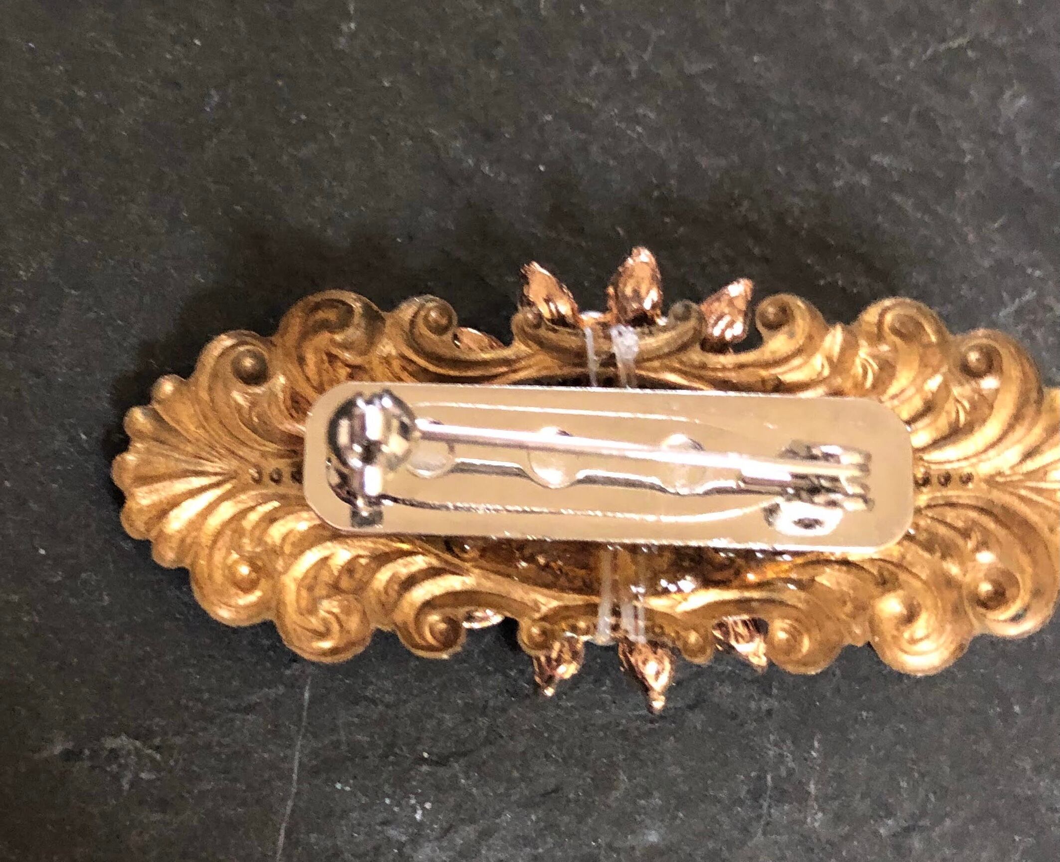 ヴィンテージのパーツを組み合わせて作製しました。 アンティークなイメージに少しキラキラ感をプラスしたブローチです。 横5センチ、縦2センチ